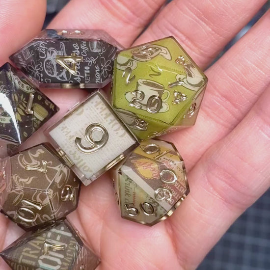 PLEASE NOTE: Any dice with clear resin elements are susceptible to epoxy resin's natural aging process. In 2-3 years, clear resin may take on a yellow-tint, though proper care like keeping them in a dark place and avoiding direct sunlight will help to prolong the designs. *All* epoxy resins eventually take on a yellow tint, it's an unavoidable part of the aging process!