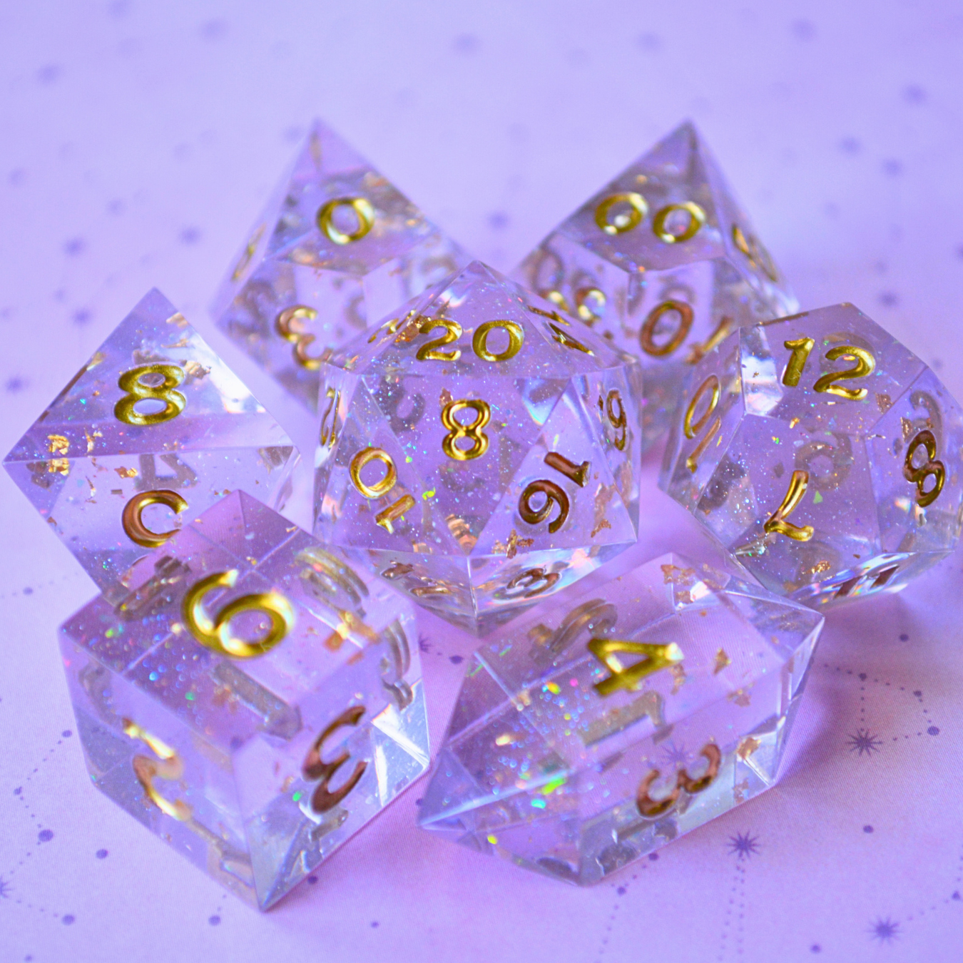 PLEASE NOTE: Any dice with clear resin elements are susceptible to epoxy resin's natural aging process. In 2-3 years, clear resin may take on a yellow-tint, though proper care like keeping them in a dark place and avoiding direct sunlight will help to prolong the designs. *All* epoxy resins eventually take on a yellow tint, it's an unavoidable part of the aging process!