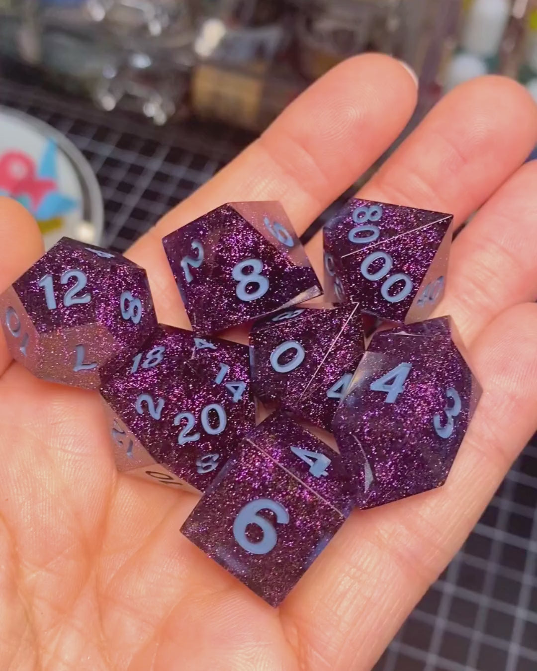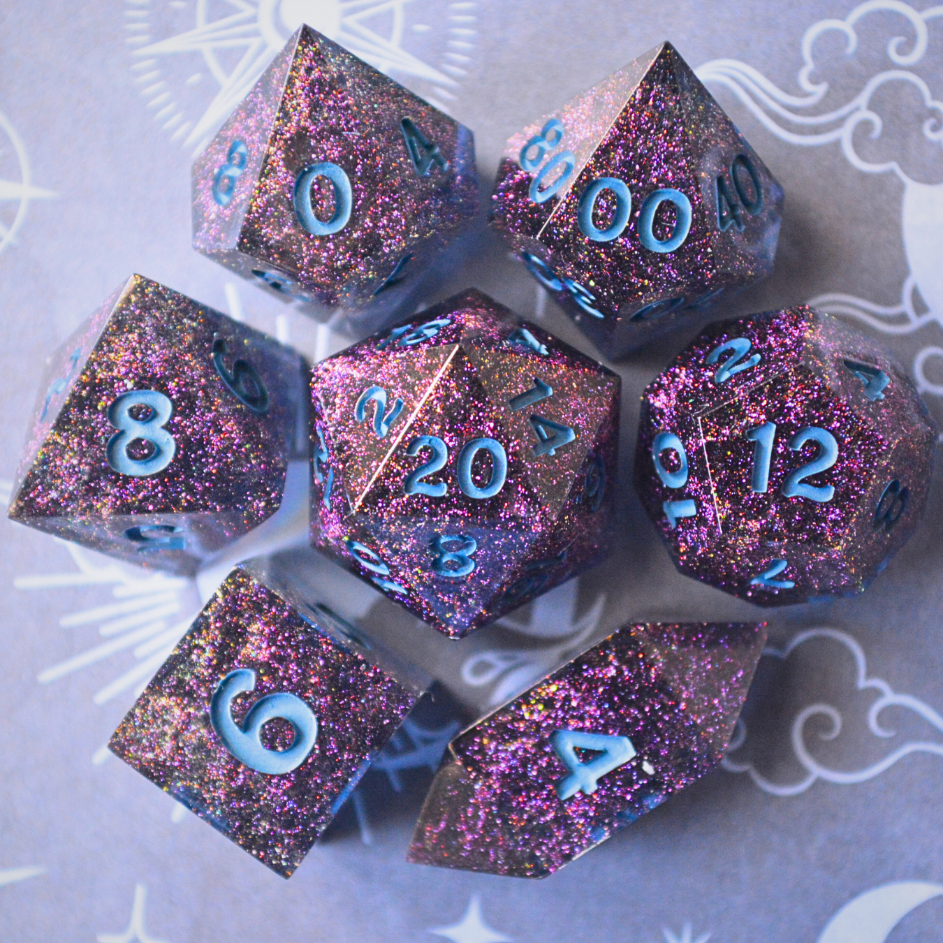 As is the nature of all handmade items, these dice may have minor handmade marks that reflect the hard work, time, and love put into making them. These marks will not impact their rollability in any way. They can include microscratches, signs of UV repair patches, breached inclusions, tiny bubbles (which can happen despite using a pressure pot), and/or mold marks. Any handmade marks will be listed with each set. Please review pictures and videos before purchasing.