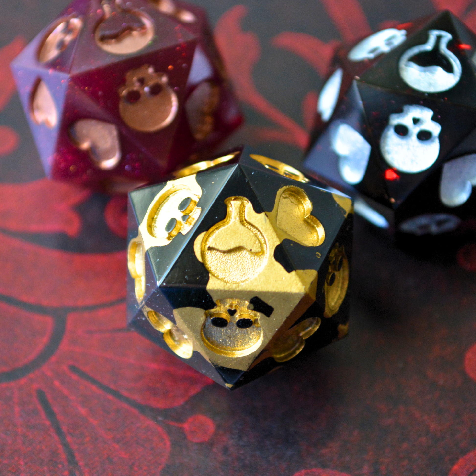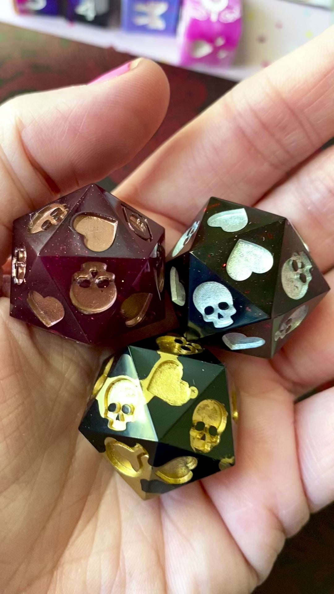 As is the nature of all handmade items, these dice may have minor handmade marks that reflect the hard work, time, and love put into making them. These marks will not impact their rollability in any way. They can include microscratches, signs of UV repair patches, breached inclusions, tiny bubbles (which can happen despite using a pressure pot), and/or mold marks. Any handmade marks will be listed with each set. Please review pictures and videos before purchasing.