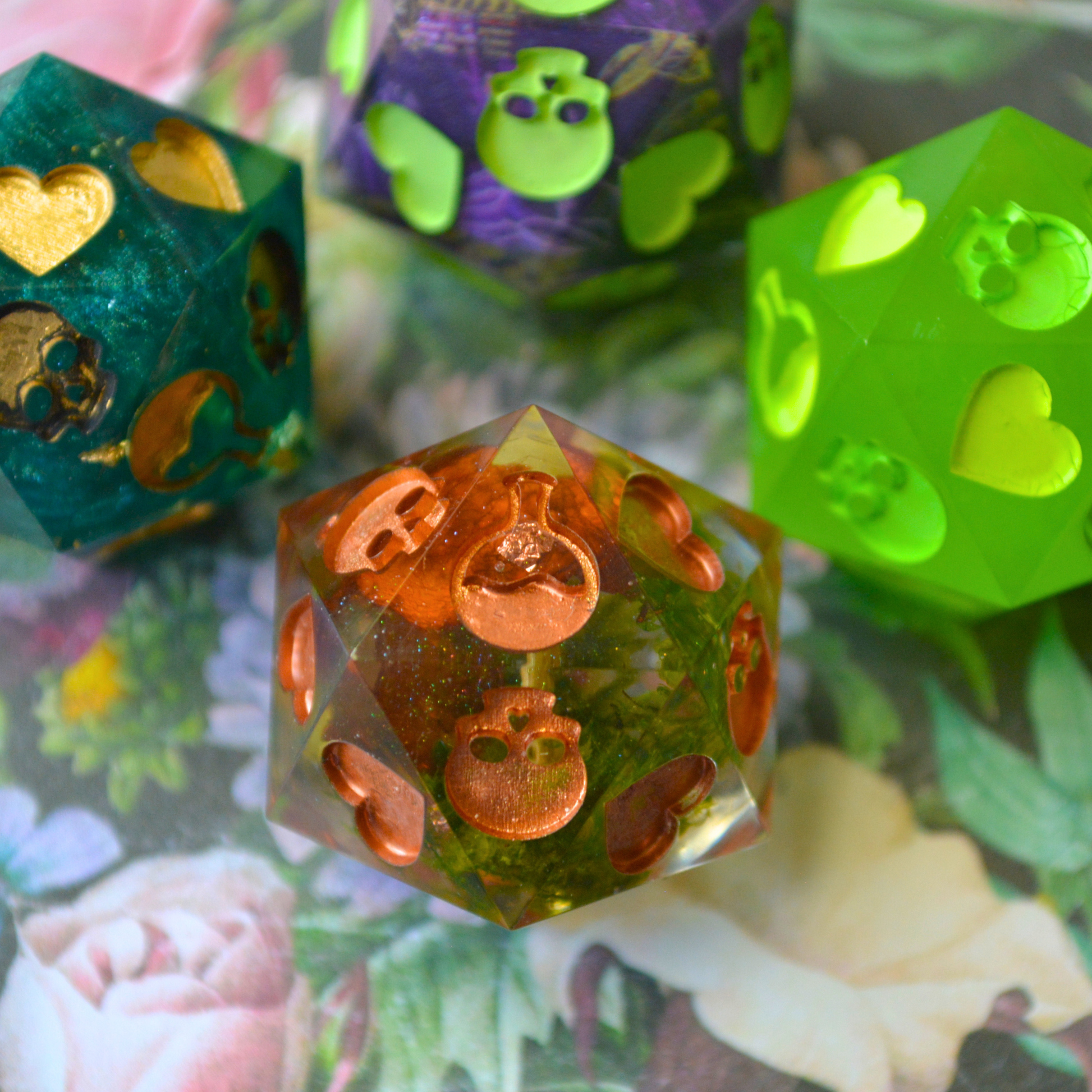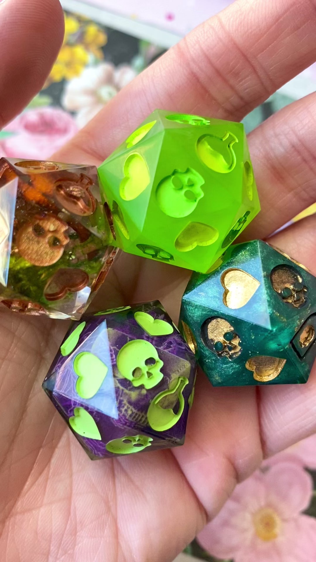 As is the nature of all handmade items, these dice may have minor handmade marks that reflect the hard work, time, and love put into making them. These marks will not impact their rollability in any way. They can include microscratches, signs of UV repair patches, breached inclusions, tiny bubbles (which can happen despite using a pressure pot), and/or mold marks. Any handmade marks will be listed with each set. Please review pictures and videos before purchasing.