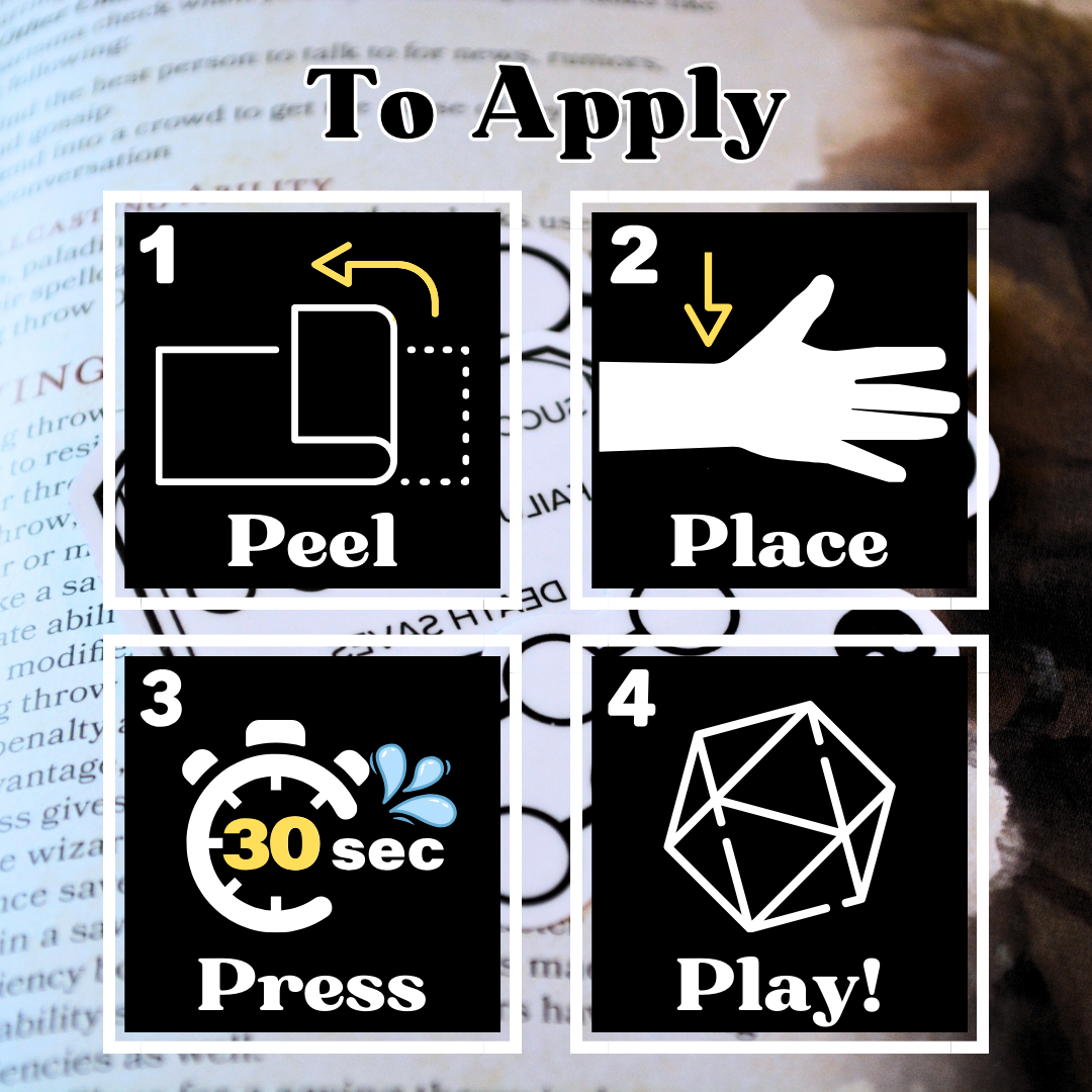 Nothing like tracking your death saves in (or rather on) the flesh! Up the stakes at your gaming table with these 2" death save temporary tattoos!