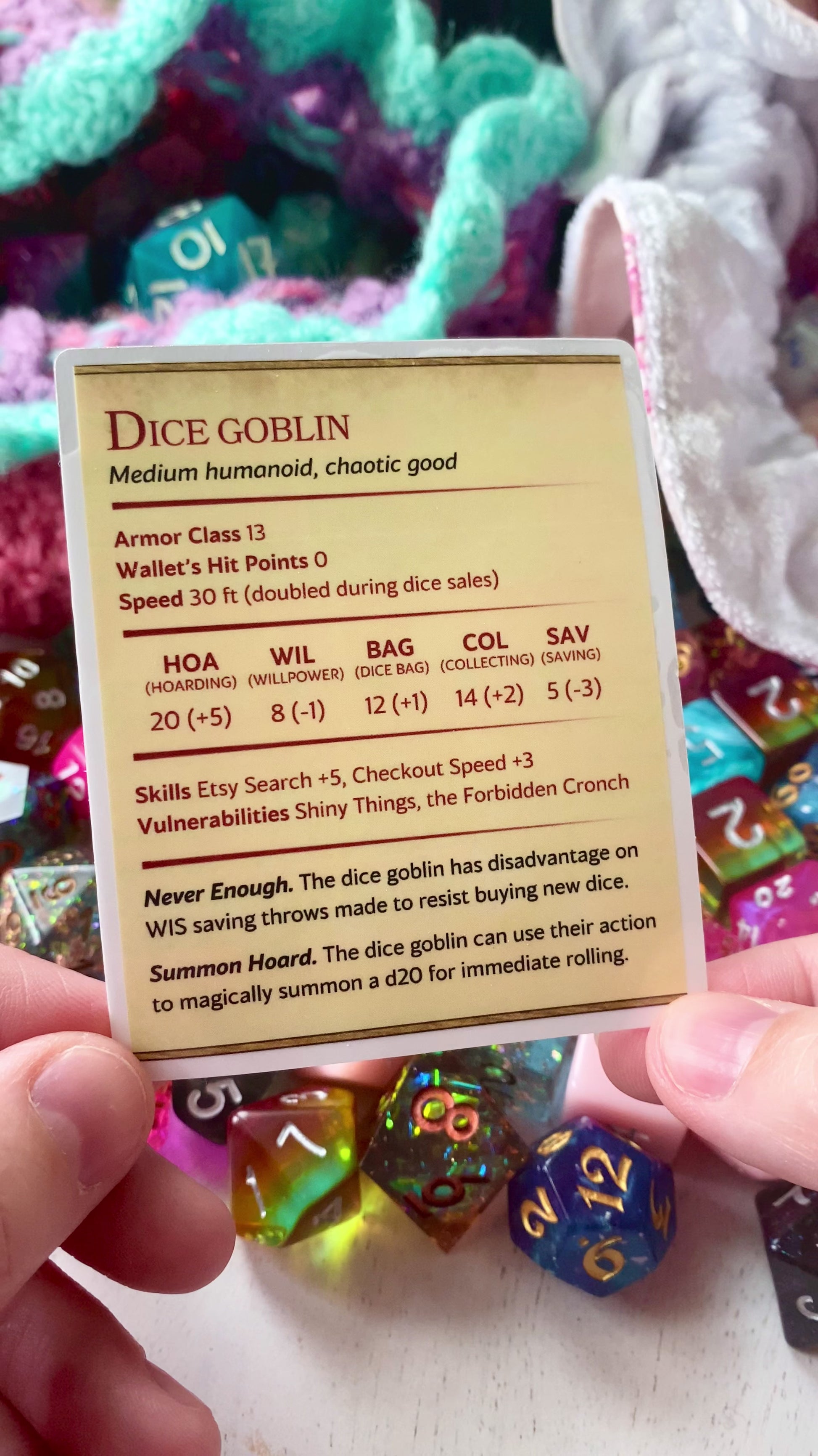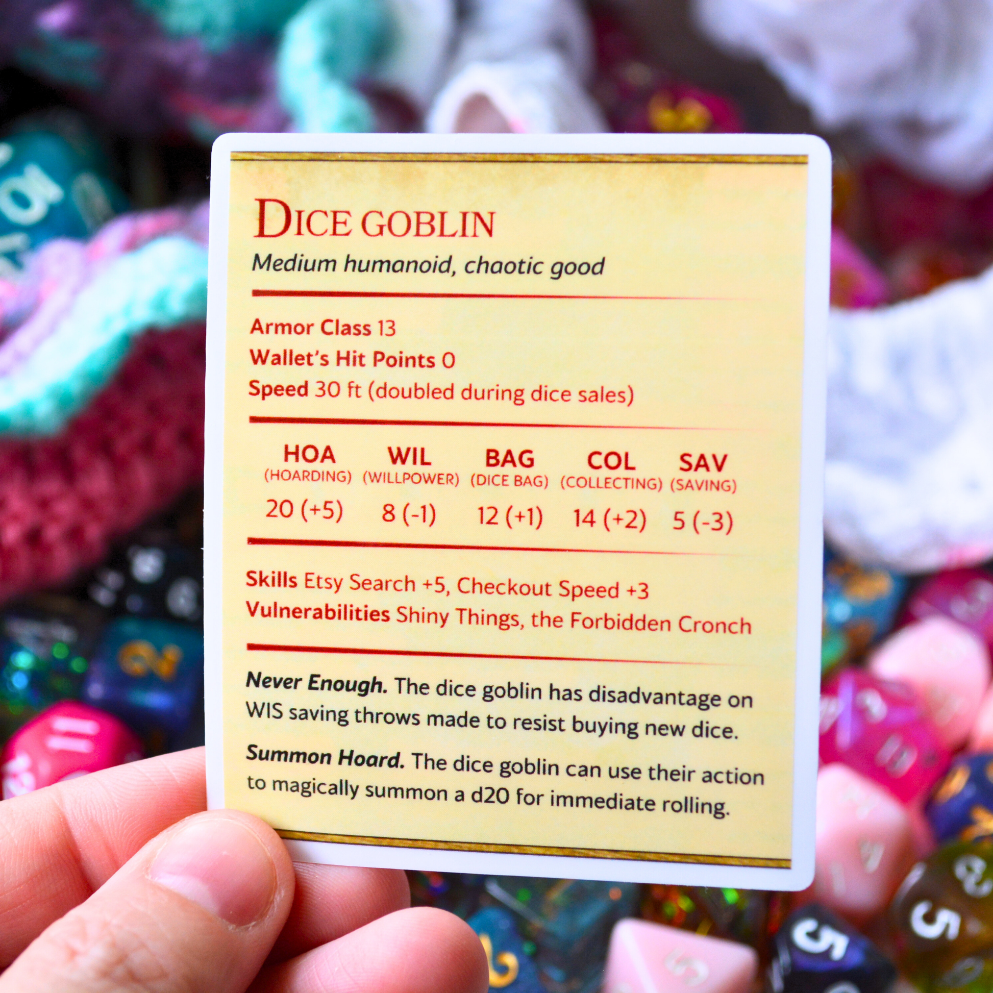 Rep your inner Dice Goblin and your hoard of beautiful click clacks with this 3″ clear statblock sticker.