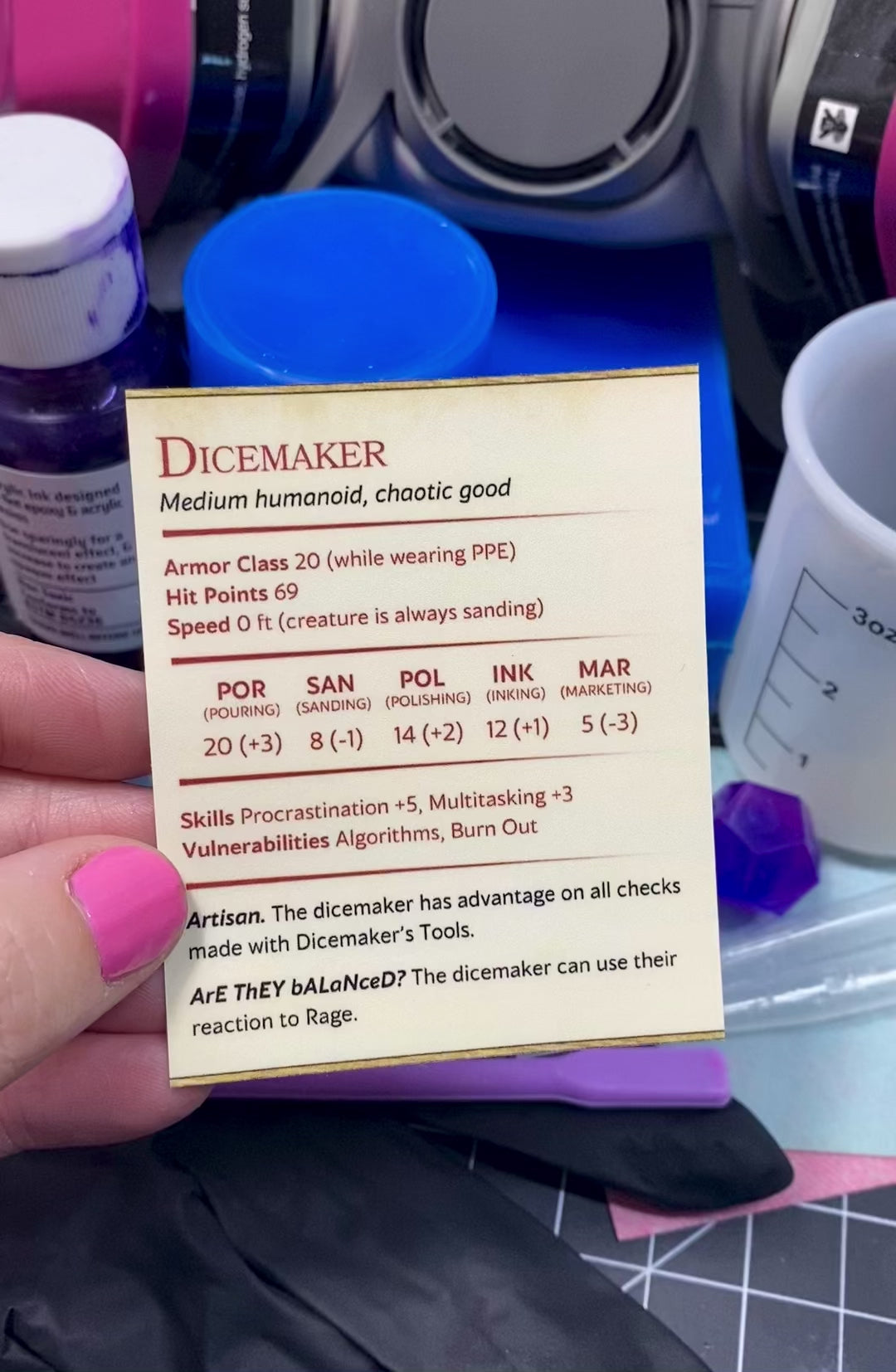 Make the Dicemaker the BBEG or the inexplicably sexy NPC in your next campaign with this 3″ vinyl statblock sticker.