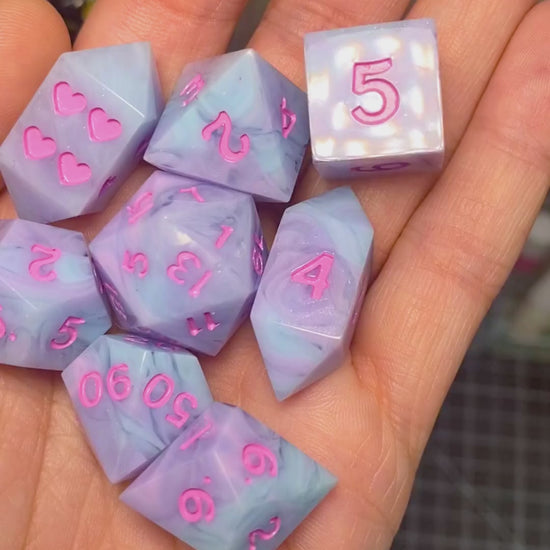 Come! Sample our delicious confections in the Dreamery! Pastel colors swirl around around this 8pc set with heart pip d4, inked in bright pink.