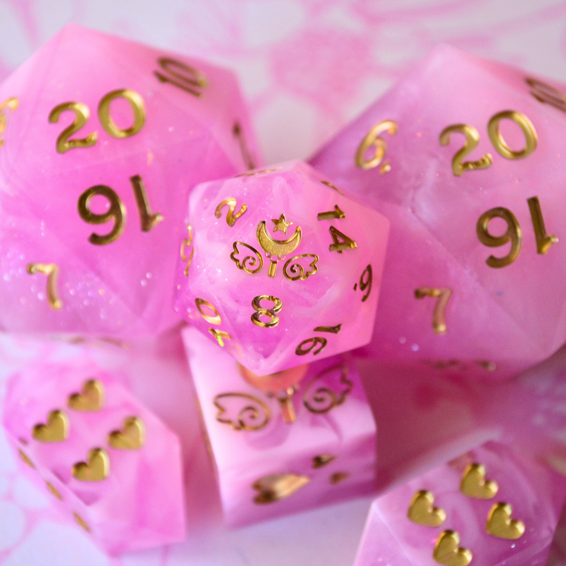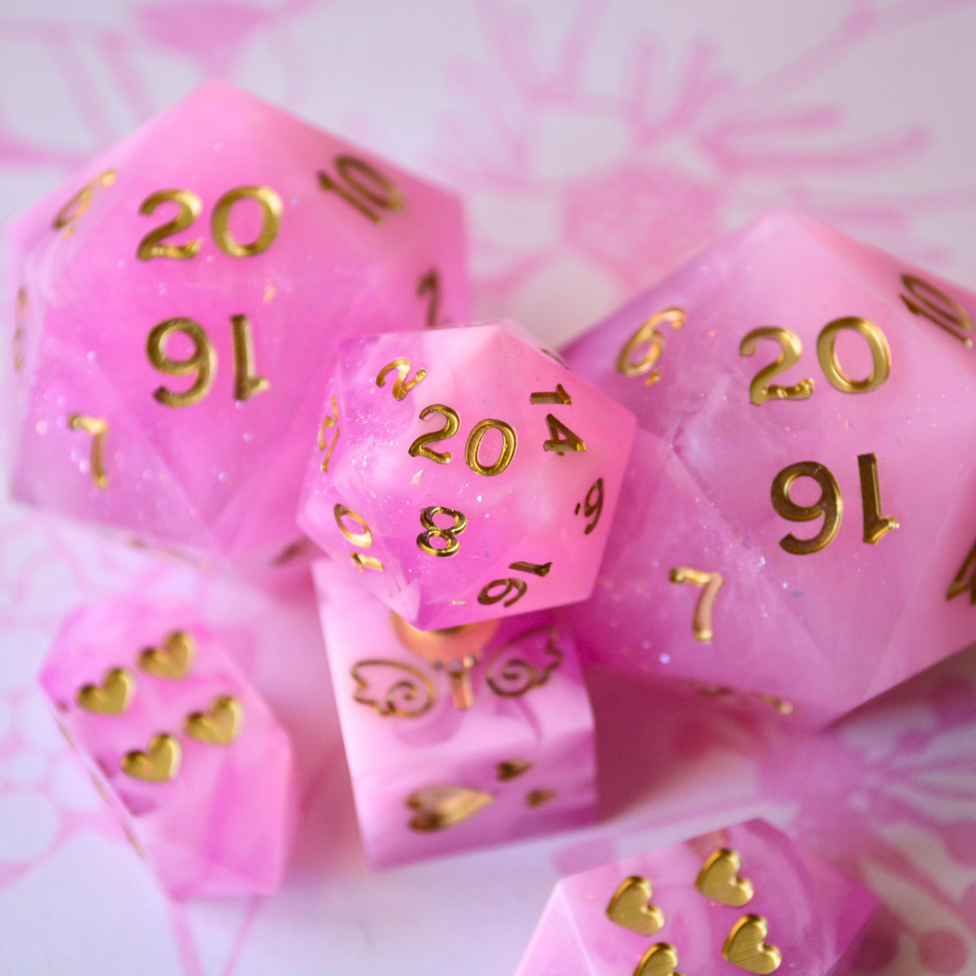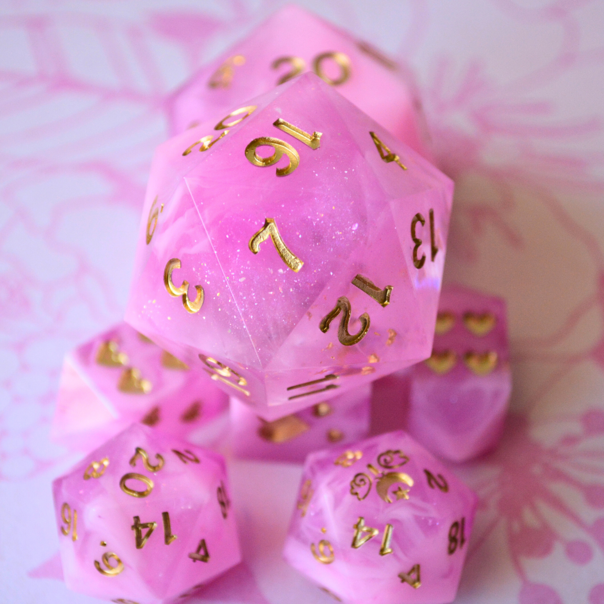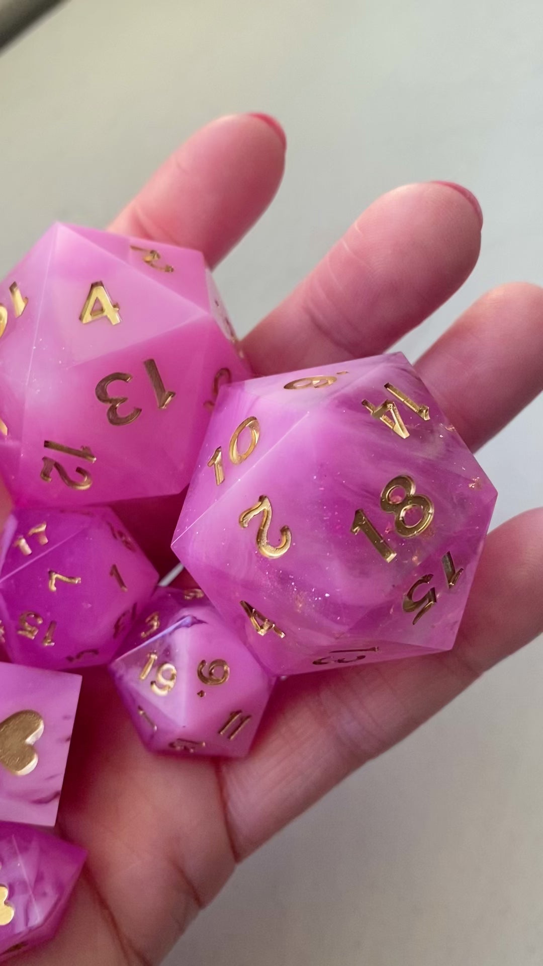 Venus herself offers her blessings in love with these swirling pink dice. Pastel pink mixes with shimmering clear and magenta resin with iridescent flakes, inked in bright gold.