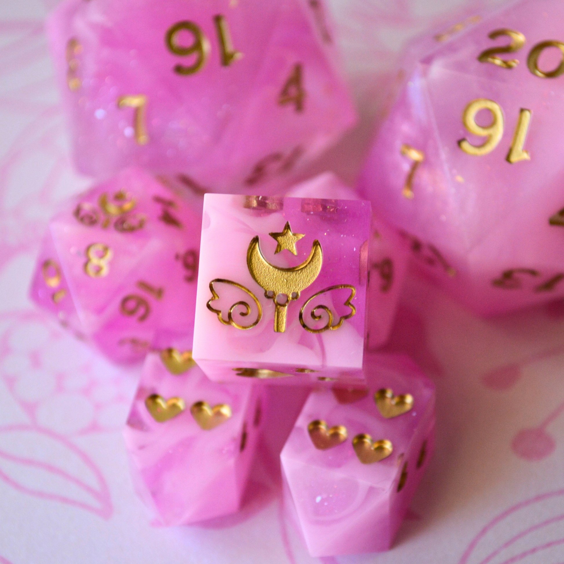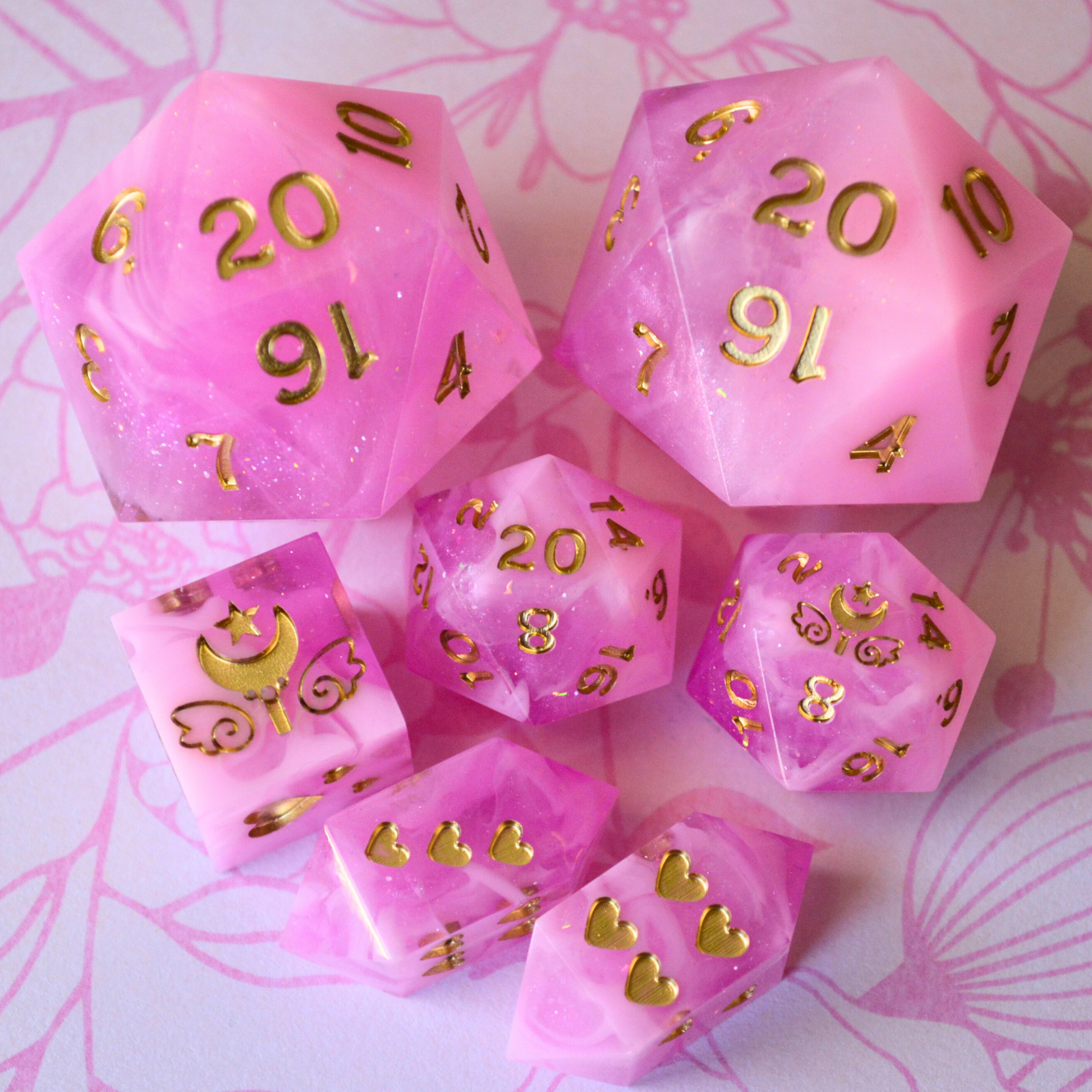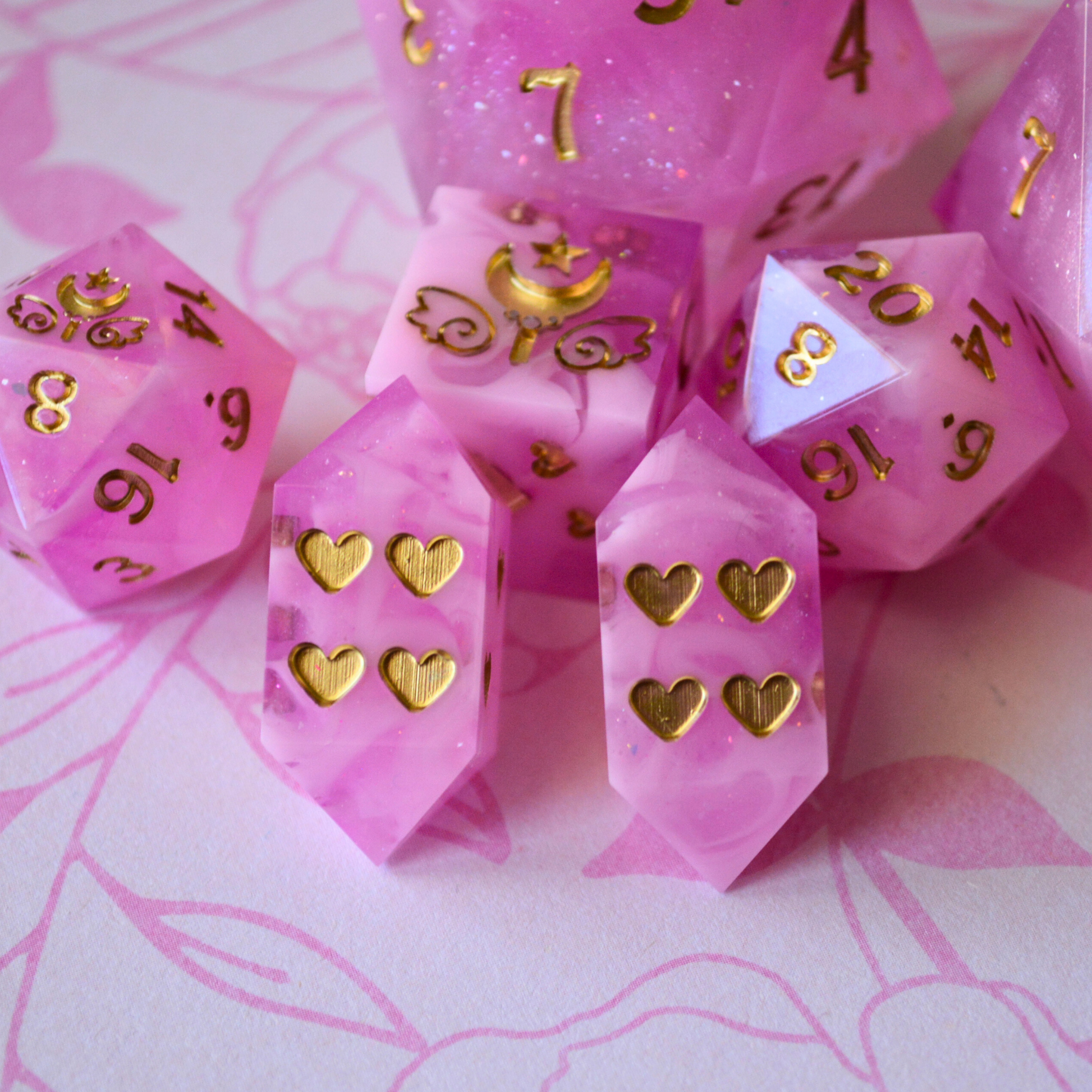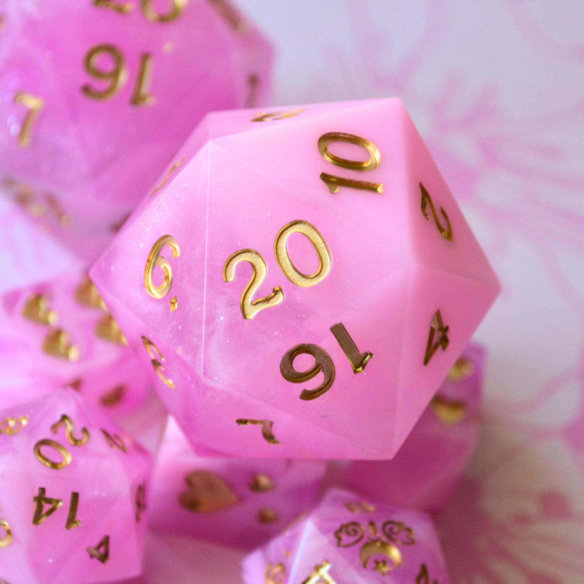 Venus herself offers her blessings in love with these swirling pink dice. Pastel pink mixes with shimmering clear and magenta resin with iridescent flakes, inked in bright gold.