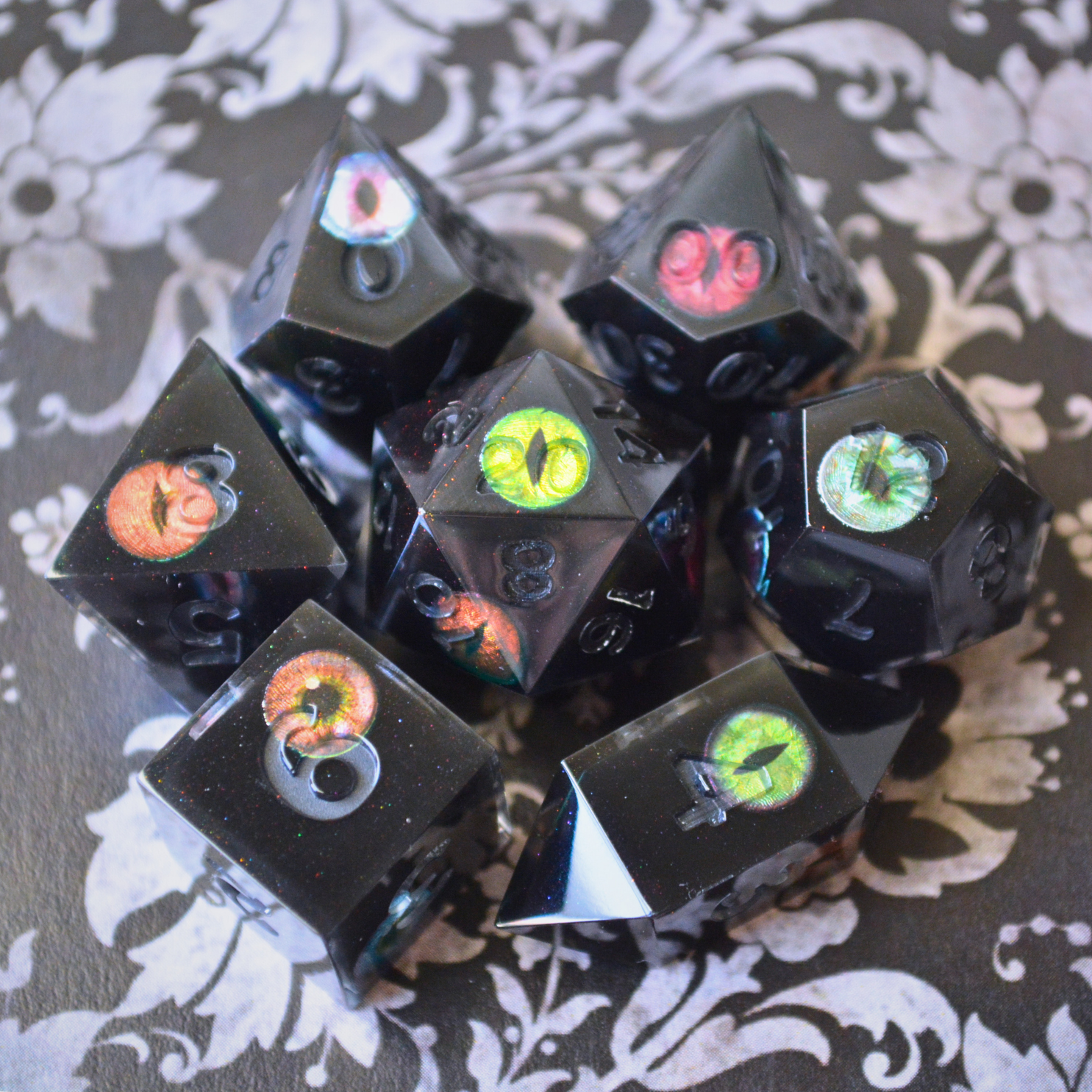 You feel the many Eyes upon you, watching from the void of every shadow. Many eyes decorate black and shimmering red resin blanks in this uninked 7pc set.
