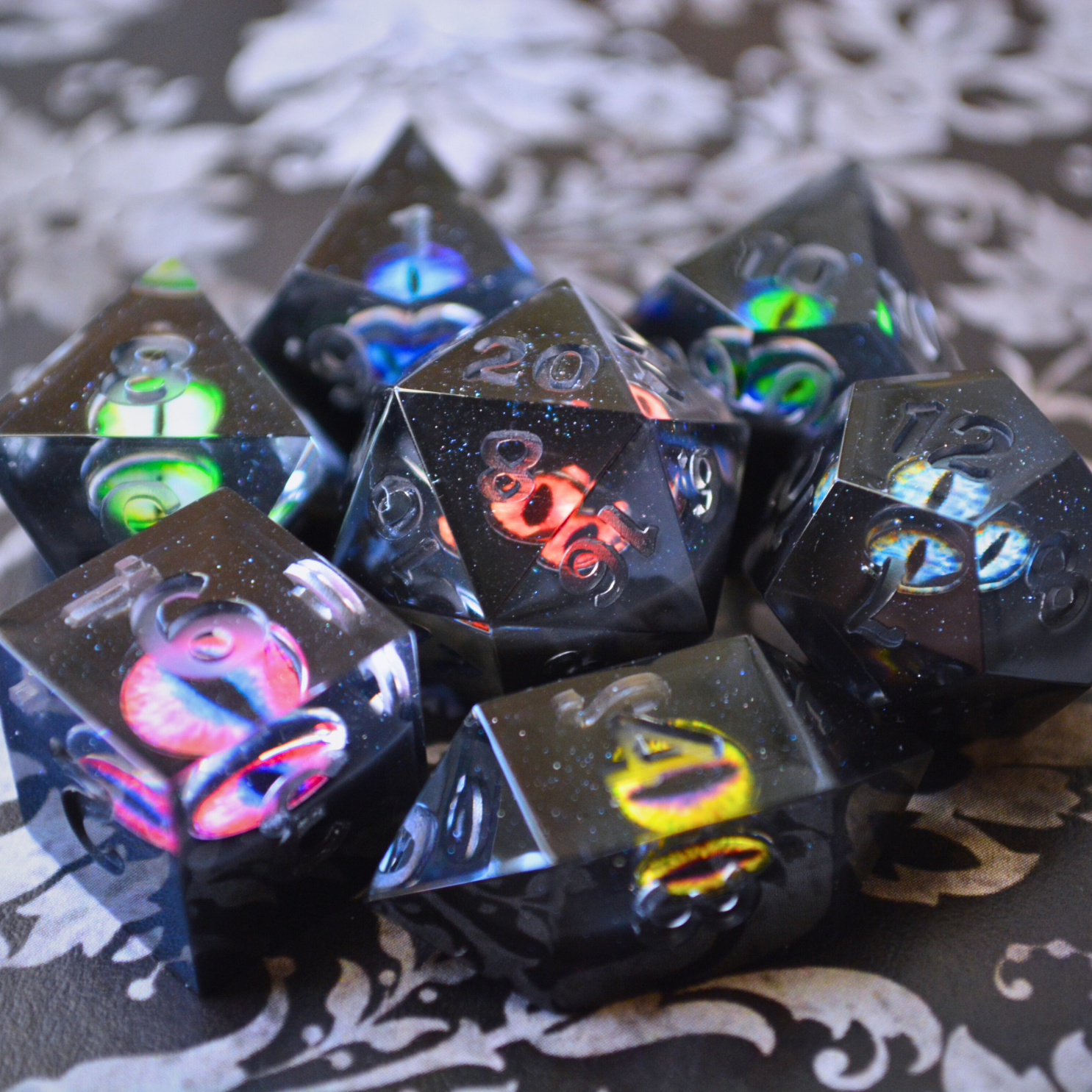 The inky ichor stares back, the laughter of a gibbering maw echoing in the darkness. Each die features a different colored eye in this uninked 7pc set.