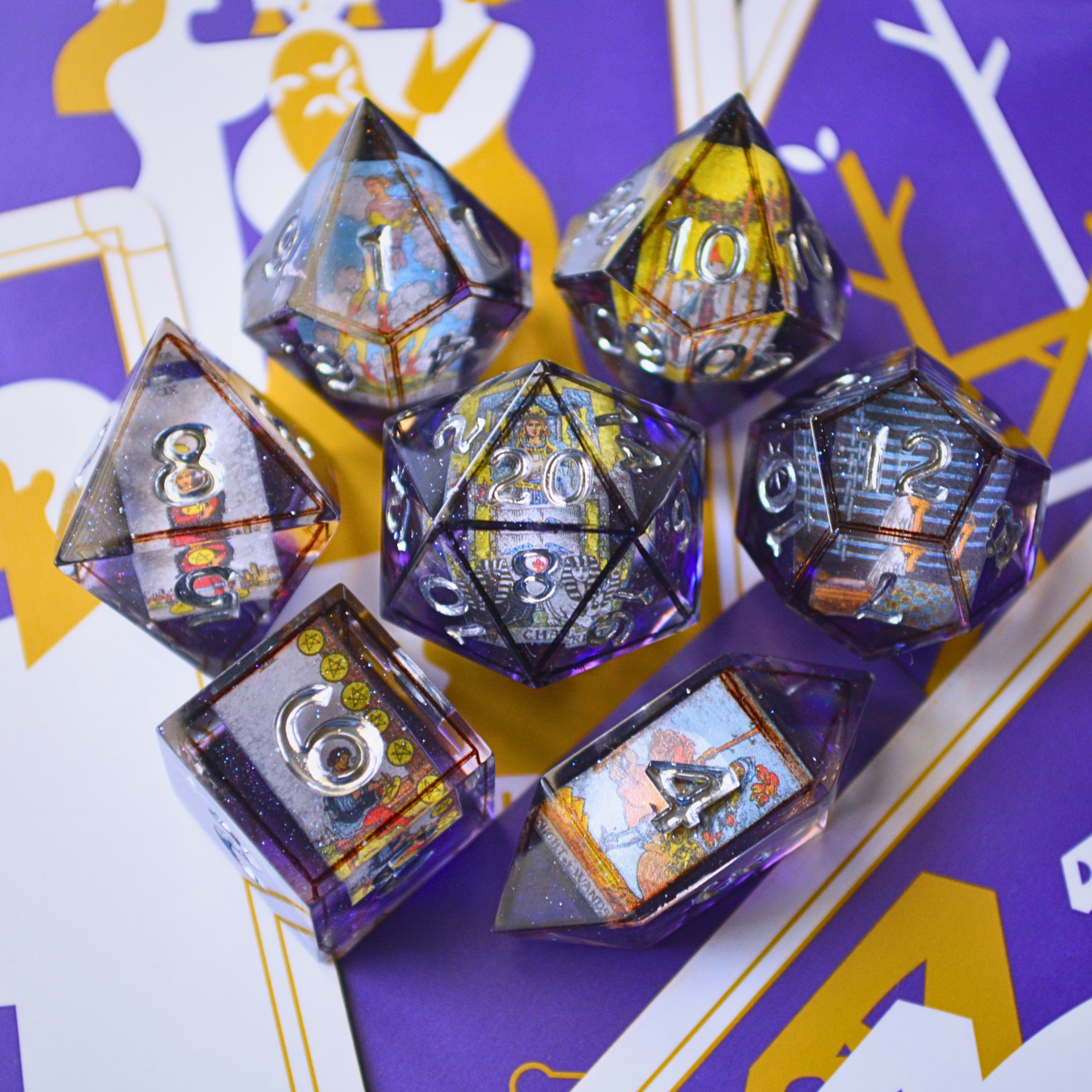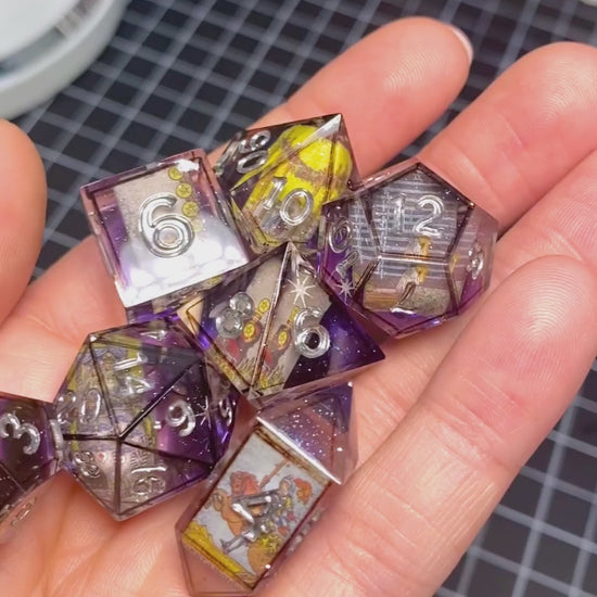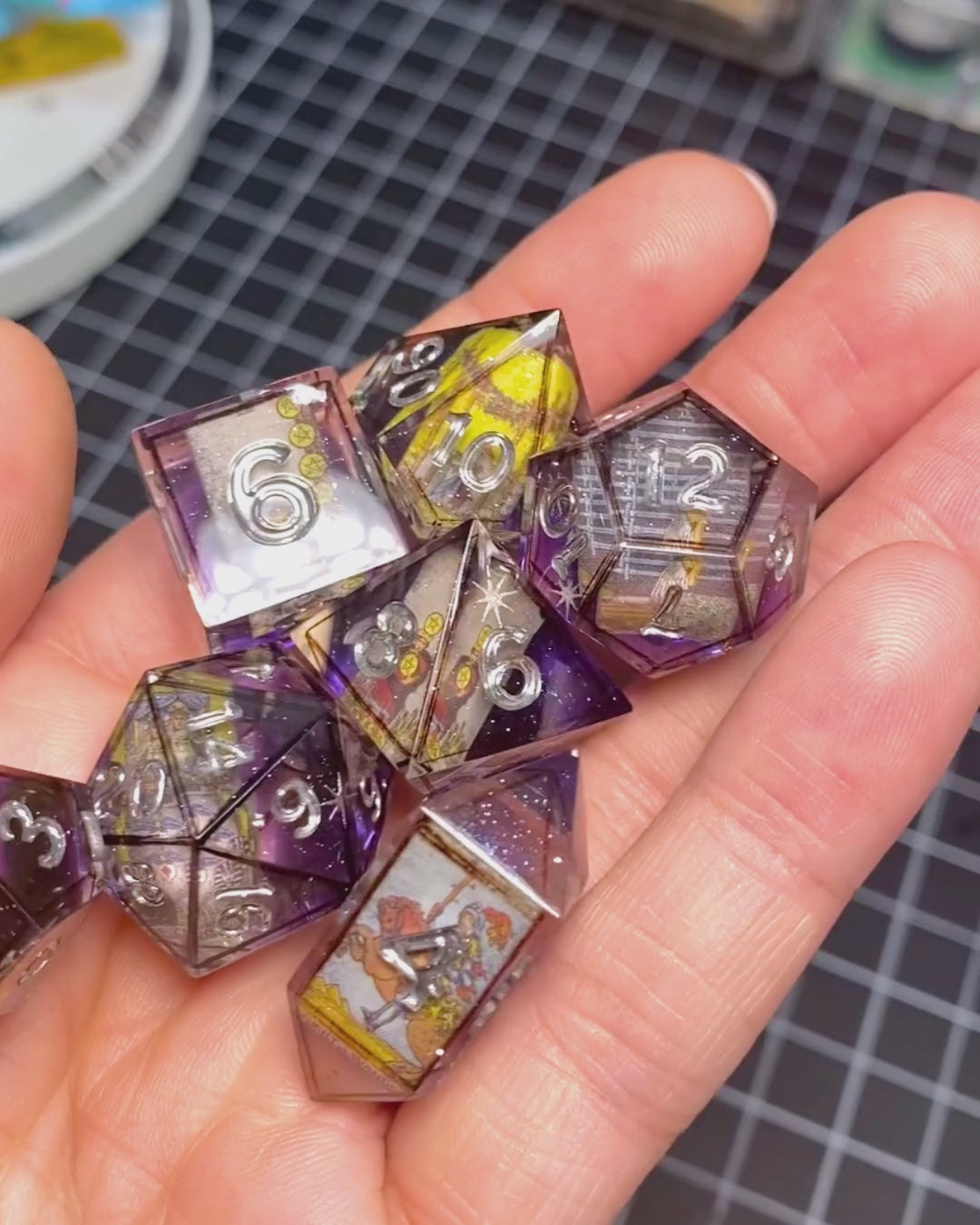 PLEASE NOTE: Any dice with clear resin elements are susceptible to epoxy resin's natural aging process. In 2-3 years, clear resin may take on a yellow-tint, though proper care like keeping them in a dark place and avoiding direct sunlight will help to prolong the designs. *All* epoxy resins eventually take on a yellow tint, it's an unavoidable part of the aging process!