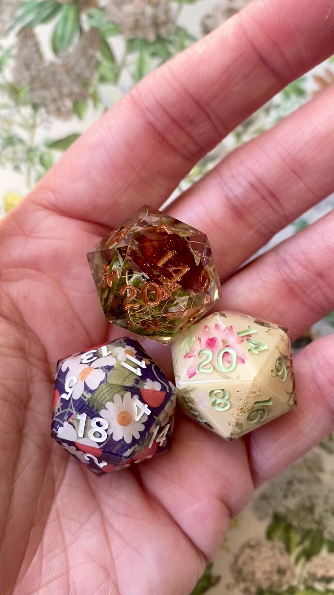 Beautiful florals, mushrooms, and berries adorn these d20s!