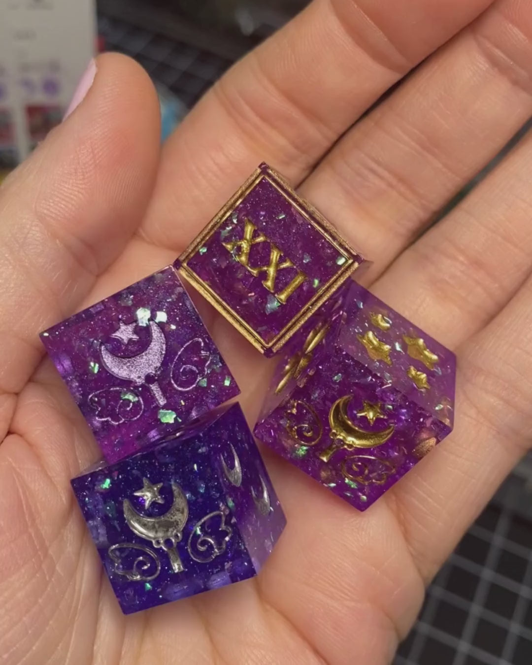 As is the nature of all handmade items, these dice may have minor handmade marks that reflect the hard work, time, and love put into making them. These marks will not impact their rollability in any way. They can include microscratches, signs of UV repair patches, breached inclusions, tiny bubbles (which can happen despite using a pressure pot), and/or mold marks. Any handmade marks will be listed with each set. Please review pictures and videos before purchasing.