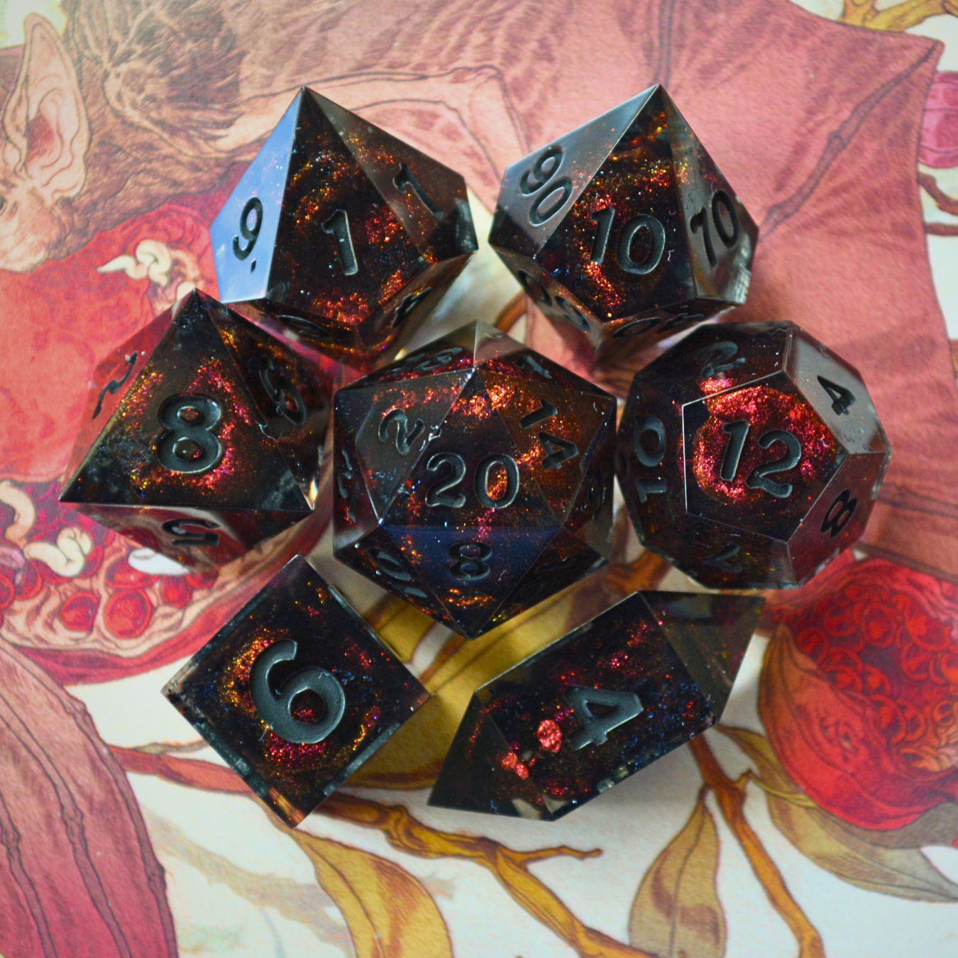 As is the nature of all handmade items, these dice may have minor handmade marks that reflect the hard work, time, and love put into making them. These marks will not impact their rollability in any way. They can include microscratches, signs of UV repair patches, breached inclusions, tiny bubbles (which can happen despite using a pressure pot), and/or mold marks. Any handmade marks will be listed with each set. Please review pictures and videos before purchasing.