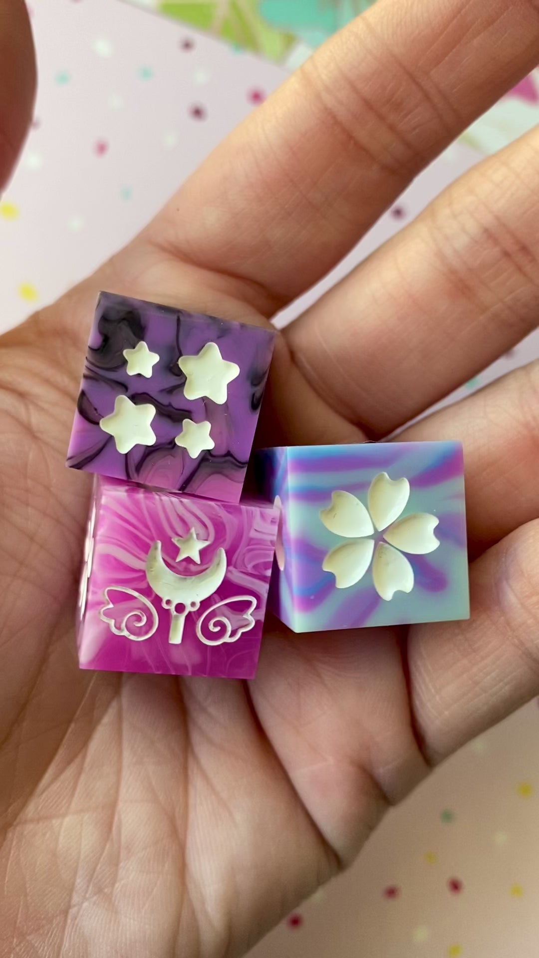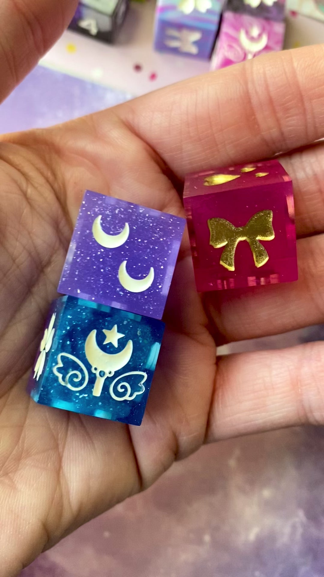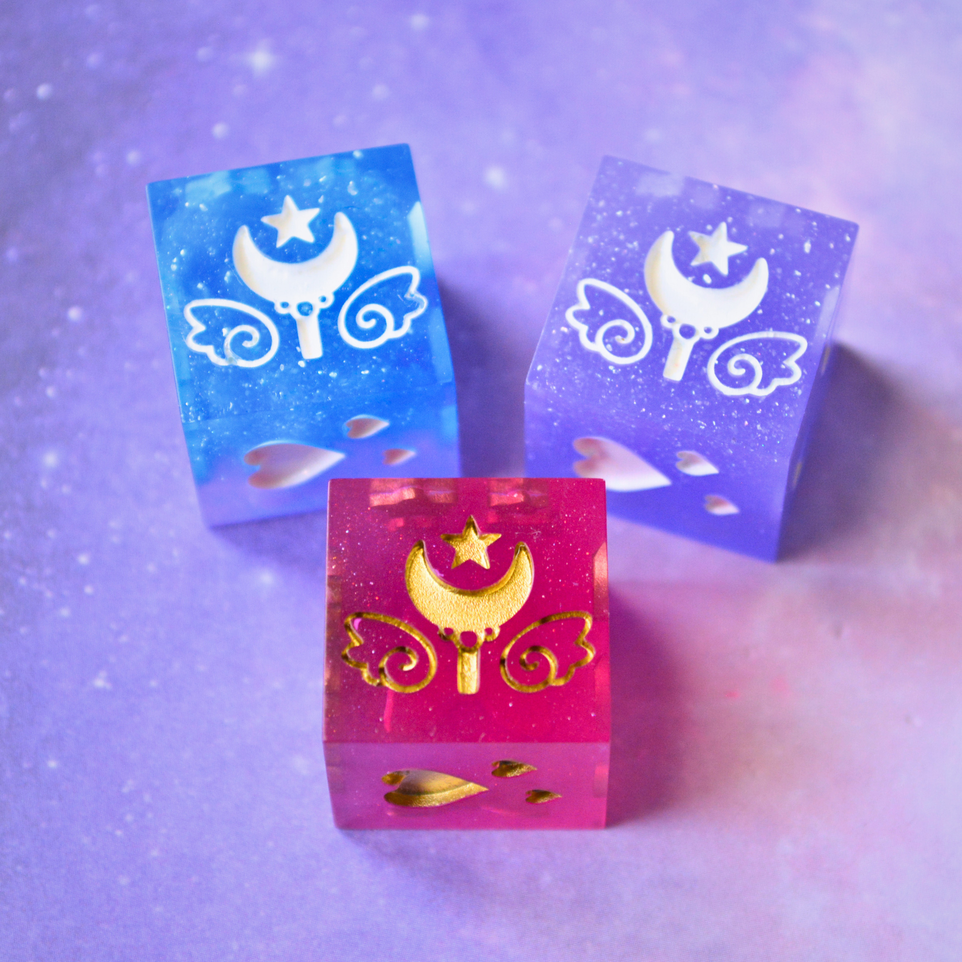 As is the nature of all handmade items, these dice may have minor handmade marks that reflect the hard work, time, and love put into making them. These marks will not impact their rollability in any way. They can include microscratches, signs of UV repair patches, breached inclusions, tiny bubbles (which can happen despite using a pressure pot), and/or mold marks. Any handmade marks will be listed with each set. Please review pictures and videos before purchasing.