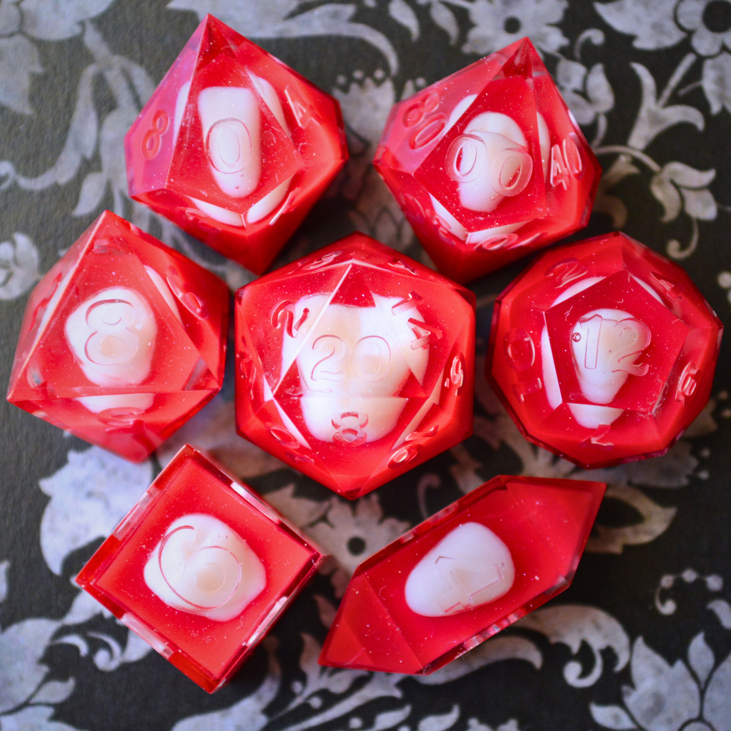 PLEASE NOTE: Any dice with clear resin elements are susceptible to epoxy resin's natural aging process. In 2-3 years, clear resin may take on a yellow-tint, though properly caring for your dice by keeping them in a dark place and avoiding direct sunlight will help to prolong the designs. *All* epoxy resins eventually take on a yellow tint as it's an unavoidable part of the aging process.