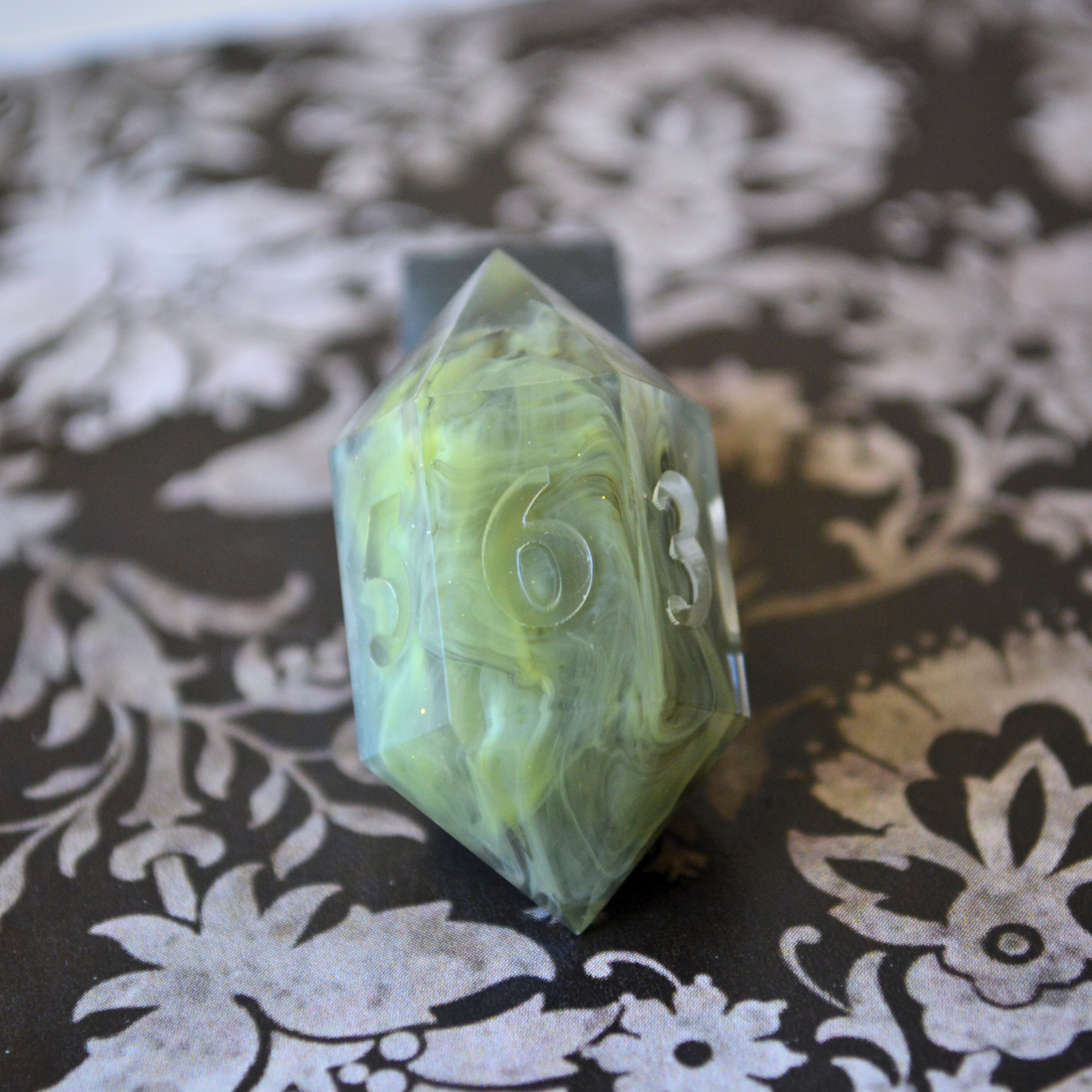 PLEASE NOTE: Any dice with clear resin elements are susceptible to epoxy resin's natural aging process. In 2-3 years, clear resin may take on a yellow-tint, though properly caring for your dice by keeping them in a dark place and avoiding direct sunlight will help to prolong the designs. *All* epoxy resins eventually take on a yellow tint as it's an unavoidable part of the aging process.