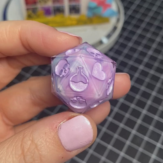 Panicking about your death saves? Keep it cute with this pastel death save d20, inked in a sparkling purple paint.