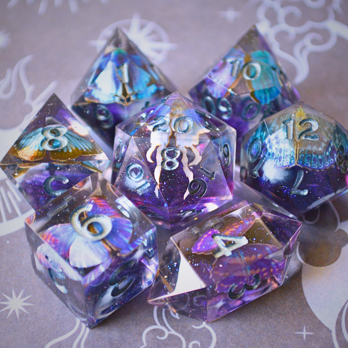 PLEASE NOTE: Any dice with clear resin elements are susceptible to epoxy resin's natural aging process. In 2-3 years, clear resin may take on a yellow-tint, though proper care like keeping them in a dark place and avoiding direct sunlight will help to prolong the designs. *All* epoxy resins eventually take on a yellow tint, it's an unavoidable part of the aging process!