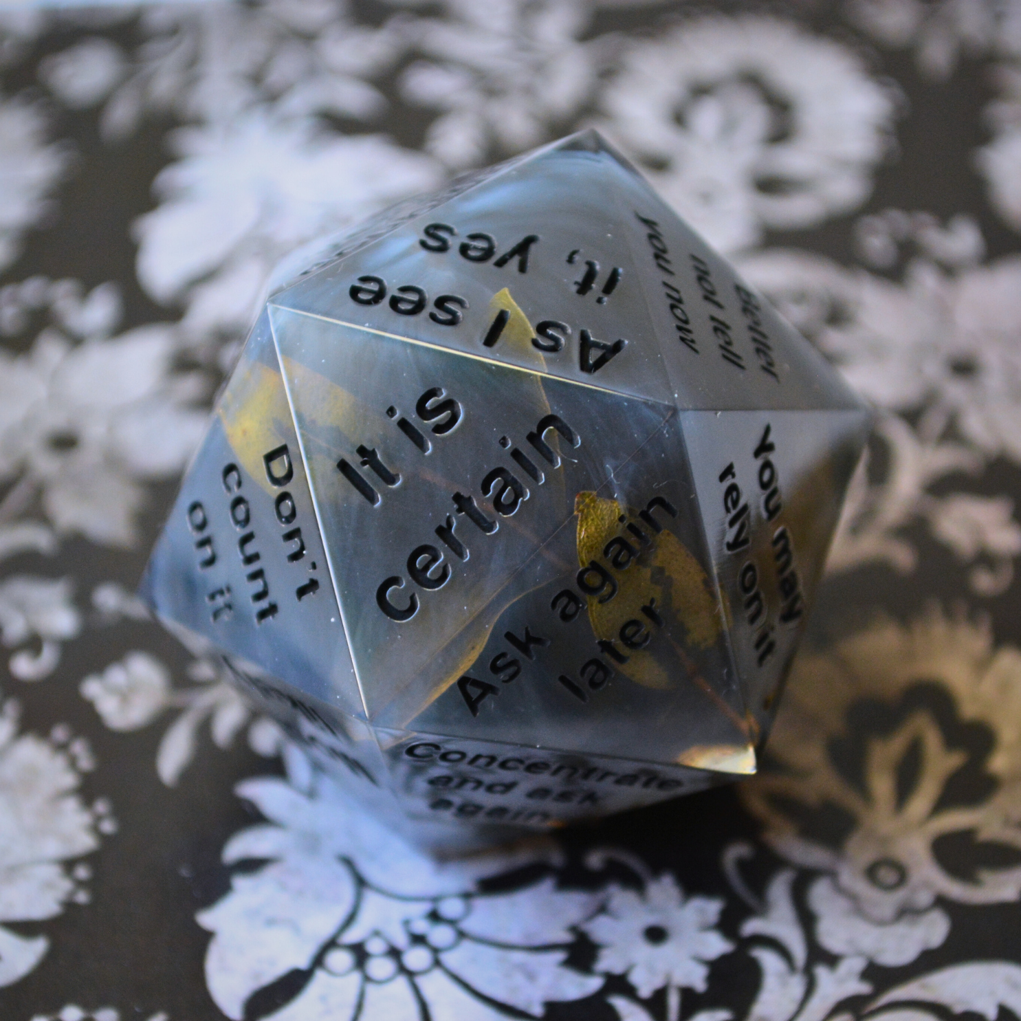 PLEASE NOTE: Any dice with clear resin elements are susceptible to epoxy resin's natural aging process. In 2-3 years, clear resin may take on a yellow-tint, though properly caring for your dice by keeping them in a dark place and avoiding direct sunlight will help to prolong the designs. *All* epoxy resins eventually take on a yellow tint. It's a completely normal reaction.