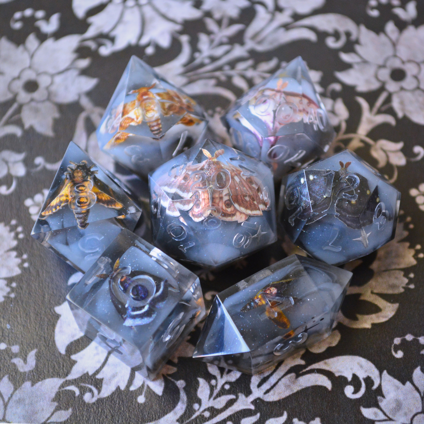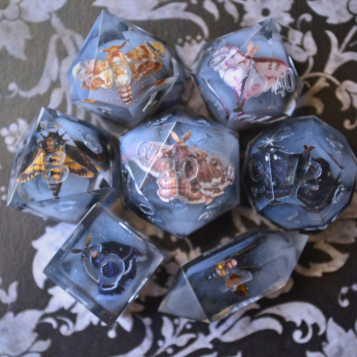 As is the nature of all handmade items, these dice may have minor handmade marks that reflect the hard work, time, and love put into making them. These marks will not impact their rollability in any way. They can include microscratches, signs of UV repair patches, breached inclusions, tiny bubbles (which can happen despite using a pressure pot), and/or mold marks. Any handmade marks will be listed with each set. Please review pictures and videos before purchasing.