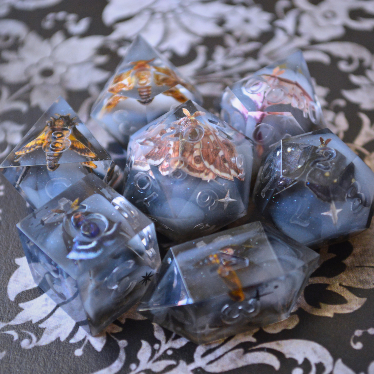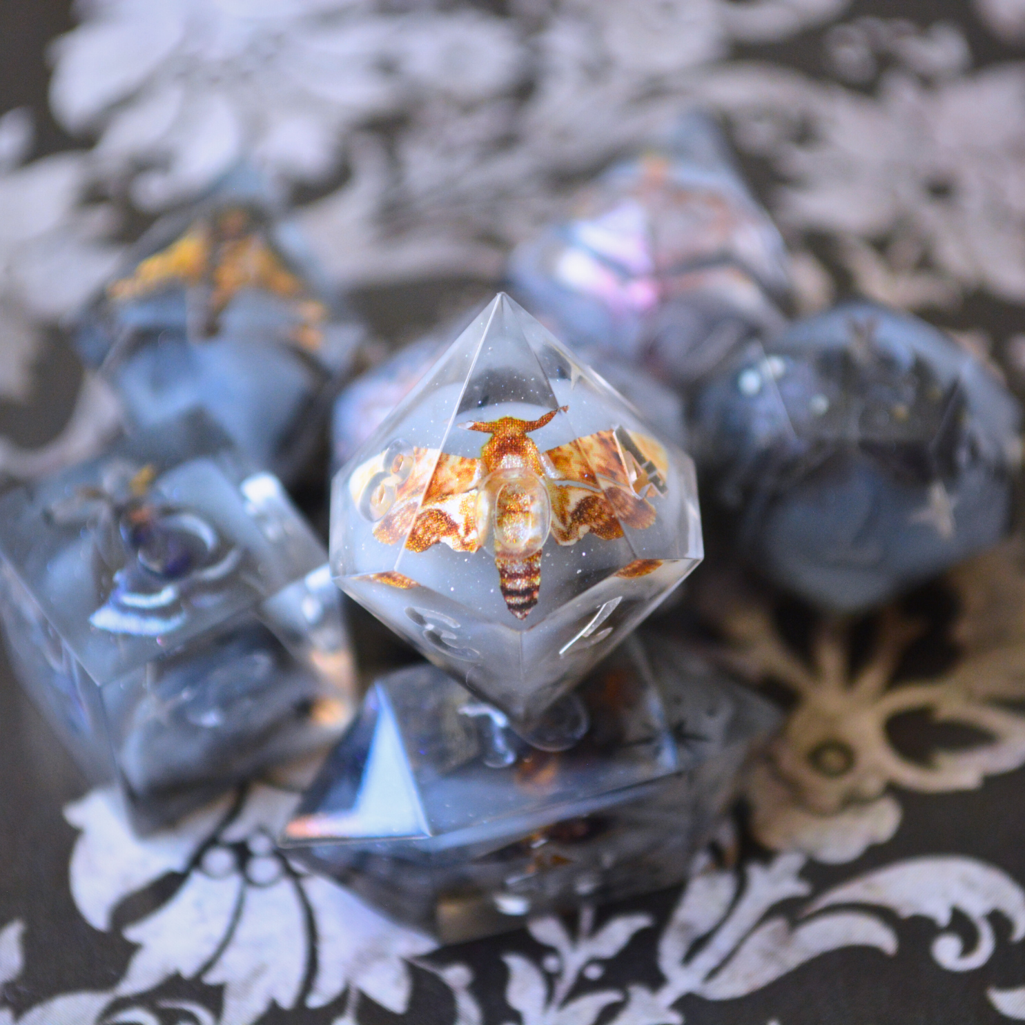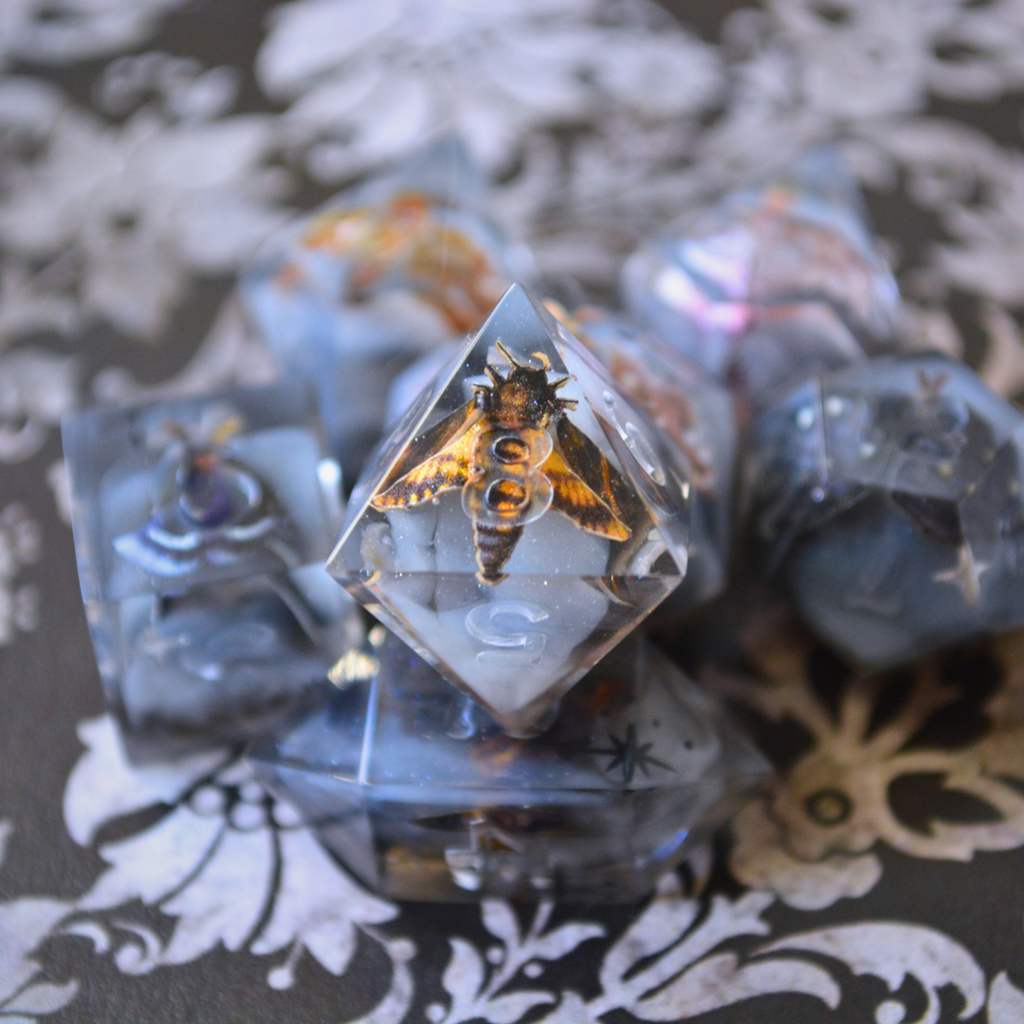 PLEASE NOTE: Any dice with clear resin elements are susceptible to epoxy resin's natural aging process. In 2-3 years, clear resin may take on a yellow-tint, though properly caring for your dice by keeping them in a dark place and avoiding direct sunlight will help to prolong the designs. *All* epoxy resins eventually take on a yellow tint. It's a completely normal reaction.