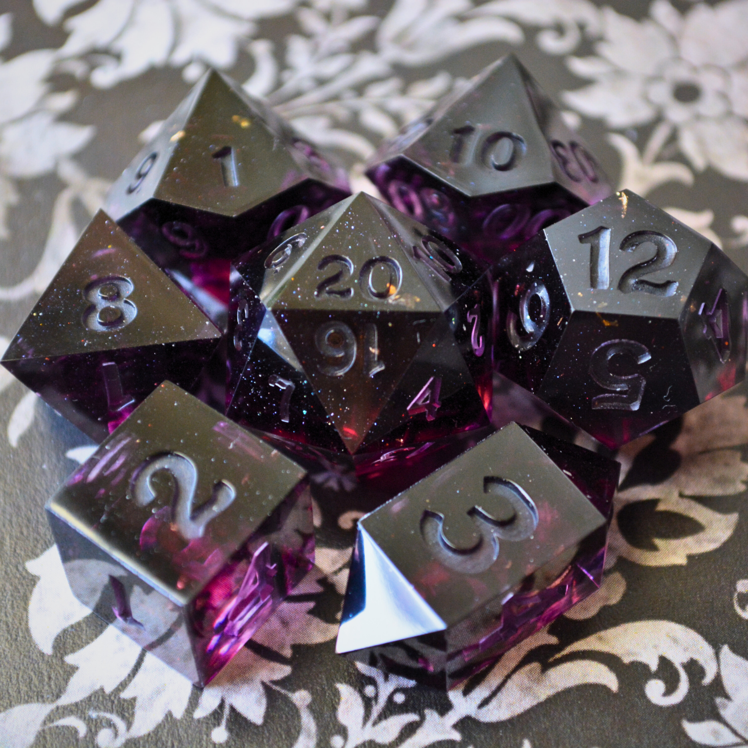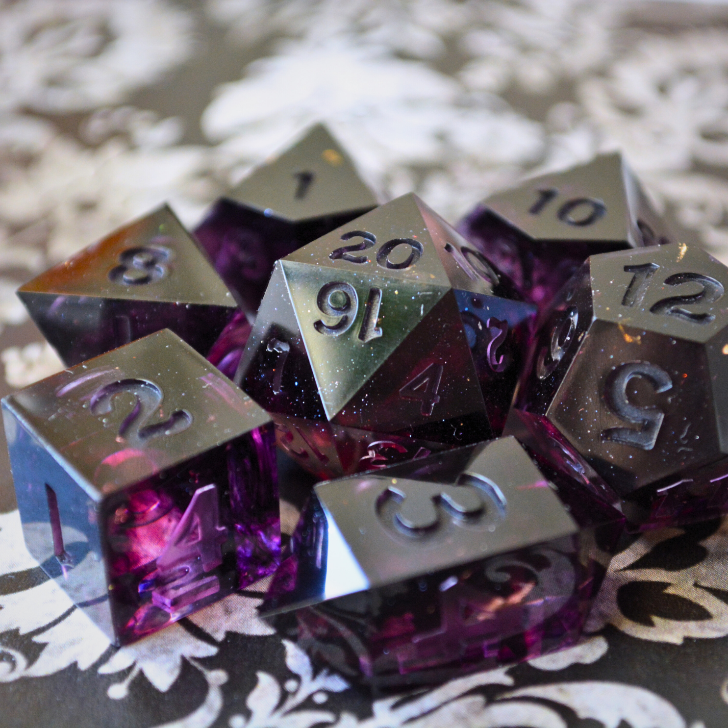 This 8pc RAW set contains a shadowy ombre of black to maroon. Includes a heart pip d4.