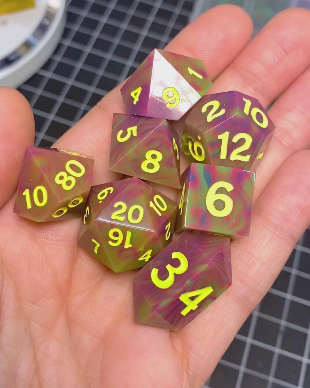 As is the nature of all handmade items, these dice may have minor handmade marks that reflect the hard work, time, and love put into making them. These marks will not impact their rollability in any way. They can include microscratches, signs of UV repair patches, breached inclusions, tiny bubbles (which can happen despite using a pressure pot), and/or mold marks. Any handmade marks will be listed with each set. Please review pictures and videos before purchasing.
