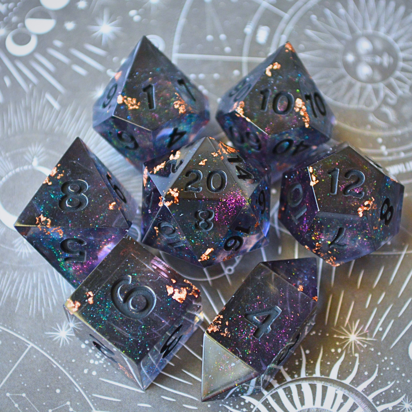 Deals and bargains for power made in secret. Clandestine meetings betweeen mortals and enigmatic entities. Glittering, colorshifting swirls sparkle within a dark resin base with bronze flake in this 7pc set, inked in matte black.