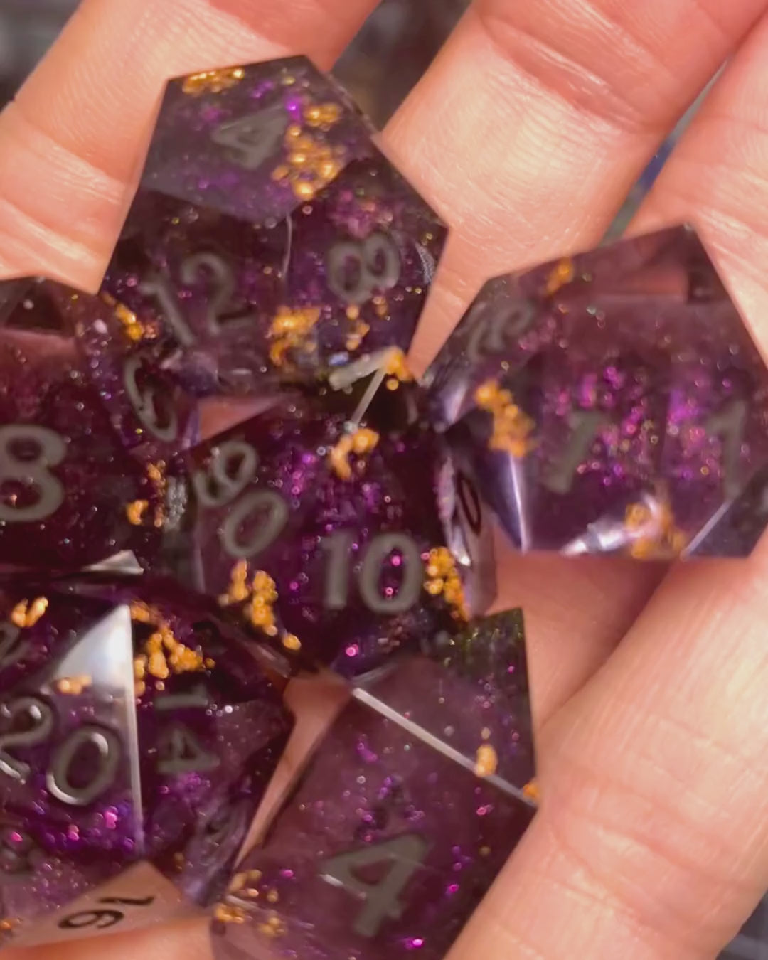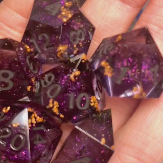 As is the nature of all handmade items, these dice may have minor handmade marks that reflect the hard work, time, and love put into making them. These marks will not impact their rollability in any way. They can include microscratches, signs of UV repair patches, breached inclusions, tiny bubbles (which can happen despite using a pressure pot), and/or mold marks. Any handmade marks will be listed with each set. Please review pictures and videos before purchasing.